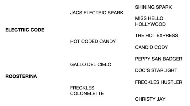 1st Dam: ROOSTERINa by Gallo Del Cielo, 2000 ANCR Futurity Non Pro 4th. Dam of: