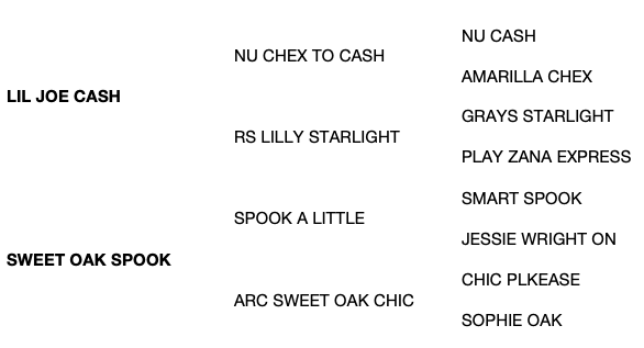 SIRE: LIL JOE CASH (2008). $279,268: NRHA Open Futurity Champion, AQHA World Champion Junior Reining Horse; finalist NRBC Open Derby, 4th NRHA Open Derby, NRBC Derby Preliminaries Open Champion, Open Perf. ROM. 2021 QData #1 Leading Sire of Ranch Riding Money-Earners; a 2021 QData Top 5 Leading Sire of Ranch Horse Money-Earners; a 2022 QData Top 10 Sire of Ranch Riding Money-Earners; a QData Top 10 All-Time Sire of Ranch Riding Money-Earners. Sire of 295 money-earners, $2,324,126, and earners of 3,168 AQHA points, including NVR WHAT A LUCKY JOE ($155,521 and 209 AQHA points: 3rd NRHA Open Top Ten, Superior Amateur Reining), JOES GENES ($138,575: NRHA Level 4 Non-Pro Futurity Co-Reserve Champion), GUNNA CASH YA ($115,341: 7th The Run For A Million Reining Inv. Open), WHOZ JOE DADDY ($106,967 to 4, 2022: split 5th NRBC Level 4 Non-Pro Derby), LIL PATRON ($82,806).
