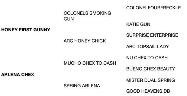 a son of COLONELS SMOKING GUN (AQHA)/COLONELS SMOKINGUN (APHA) (1993). $177,386: NRHA Hall of Fame; NRHA Open Futurity Reserve Champion. QData and NRHA #1 All-Time Leading Sire of Reining Money-Earners. Sire of 897 money[1]earners, $14,588,537, earners of 8,431 AQHA points, including NO SMOKING REQUIRED ($564,559: The Run For A Million Reining Inv. Open Co-Champion), CUSTOM MADE GUN ($420,690: The Run For A Million Reining Inv. Open Co[1]Champion). Sire of the dams of AMERICASNEXTTOPGUN ($345,893: NRBC Open Derby Champion), AMERICAS SUPERMODEL ($232,226: AQHA World Champion Junior Reining Horse; 3rd NRHA Open Futurity), MS DREAMY ($209,660).