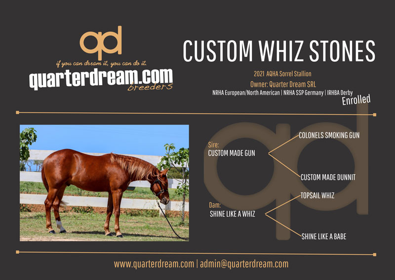 Dam: SHINE LIKE A WHIZ (2015 NRHA Austrian Futurity 4 yrs Open 4th piace with 220 | by Topsail Whiz NRHA 12 Million Dollar Sire, X Shine Like A Babe NRHA/NRCHA Money Earner and NRHA Producer of $ 56,200.00)