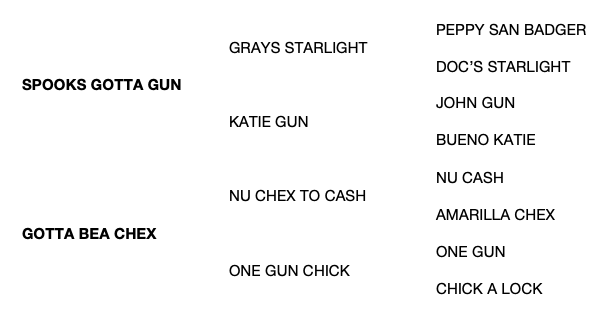 SIRE: SPOOKS GOTTA GUN (AQHA/APHA) (2002). $81,637 and 19 AQHA points: APHA World Champion Junior Reining Horse; 3rd NRHA Open Derby, Reining by the Bay Open Derby Champion, West Coast Spectacular Reining Open Derby Reserve Champion, 3rd AQHA World Senior Reining; Open Perf. ROM. Half-brother to COLONELS SMOKING GUN (1993). ($177,386: NRHA Hall of Fame; NRHA Open Futurity Reserve Champion, APHA World Champion, USET Finals Champion, APHA World Open Reining Futurity Champion. QData and NRHA #1 All-Time Leading Sire of Reining Money-Earners. Sire of 897 money-earners, $14,588,537, earners of 8,431 AQHA points), HOLLYWOOD GOTTA GUN ($115,489: 4th NRHA Open Futurity). QData #1 All-Time Leading Sire of Ranch Riding Money-Earners; a QData Top 5 All-Time Sire of Ranch Horse Money-Earners. Sire of 306 money-earners, $2,973,743, and earners of 4,030 AQHA points; including SPOOKS GOTTA WHIZ (AQHA/APHA (2007). $346,715: NRHA Open Futurity Champion, NRBC Open Derby Champion. The 2022 QData #3 Leading Sire of Reining Money-Earners; a QData Top 10 All-Time Sire of Reining Money-Earners. Sire of 296 money-earners, $4,752,161, and earners of 1,300 AQHA points), SPOOKSGOTTACHICOLENA ($155,106: NRBC Open Derby Co-Reserve Champion Champion), OOPS ITSA SPOOKS ($125,559: split 6th NRHA Open Futurity), IFWHIZSWEREGUNS ($118,578).